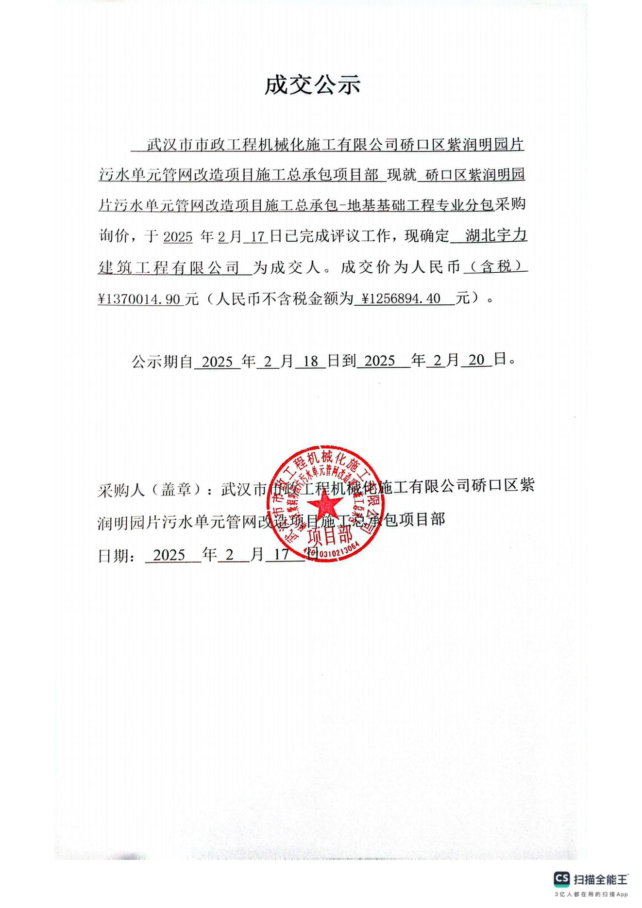 硚口區(qū)紫潤(rùn)明園片污水單元管網(wǎng)改造項(xiàng)目施工總承包-地基基礎(chǔ)工程專業(yè)分包成交公示