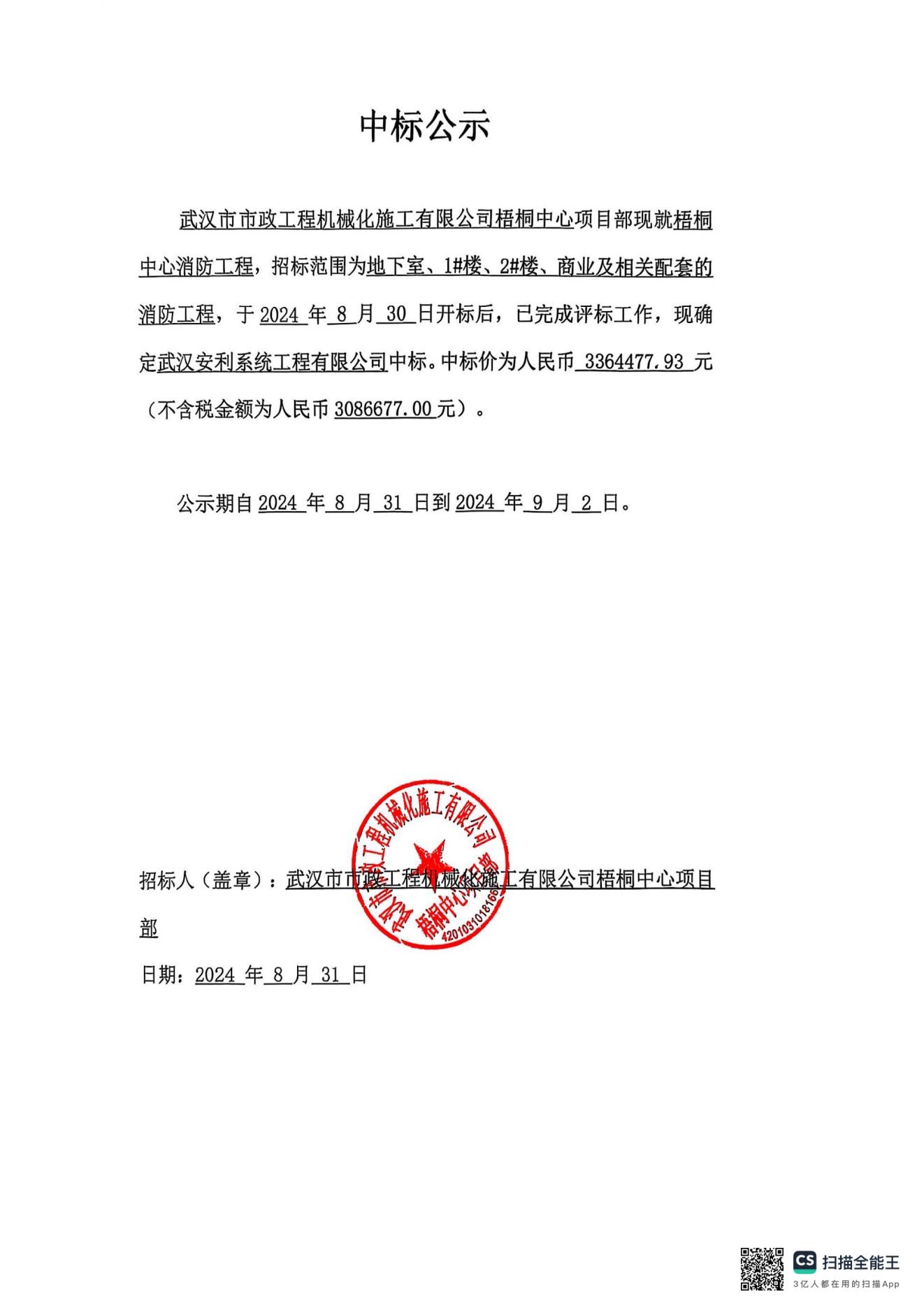 梧桐中心消防工程中標公示